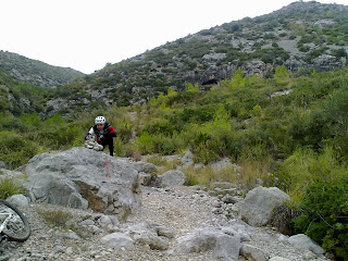 Al cabo de un rato y en plena riera, nos toca patear durante mucho tiempo ya que era imposible ciclar los pedruscos que nos íbamos encontrando (imposible fiarse de algunos caminos al hacer los tracks, pero para saber si son buenos, hay que investigarlos. Y eso es lo que hicimos, jajaja....).